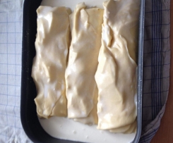 - Links und rechts einschlagen und von vorne her einrollen. Dann in eine Auflaufform geben. Mit den beiden anderen Teigen genau so verfahren.