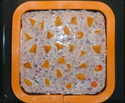 Restliche Aprikosenviertel nochmals halbieren und auf der Quarkmasse verteilen (sinken ein)