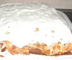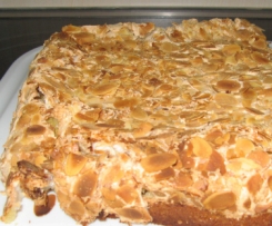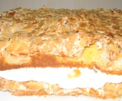 Nun benötigt man eine 26er Springform bzw wer hat eine zweite. Springform leicht fetten und Backpapier einlegen. Die erste!!! Hälfte!!! Teig einfüllen und dann die Hälfte Baiser drauf geben. Mit 100 g Mandeln bestreuen. So verfährt man auch mit der zweiten Kuchenhäfte