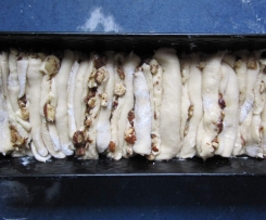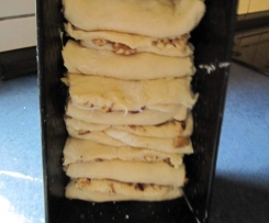 Die Kastenform hochkant stellen. Die Teigstücke zusammenklappen, ein wenig in Länge und Breite ziehen und in die Form schichten. Die Öffnungen sollen dabei abwechselnd nach vorne oder hinten zeigen.