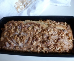 Teig in eine 25 cm lange, gut gefettete Kastenform füllen, mit Walnüssen und Zimtzucker bestreuen, dann etwas in den Teig drücken und den Kuchen für 1 Stunde im vorgeheizten Ofen bei 170° C. backen.