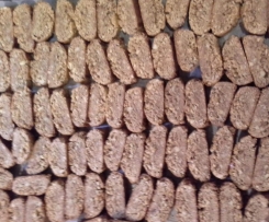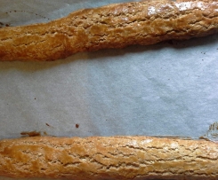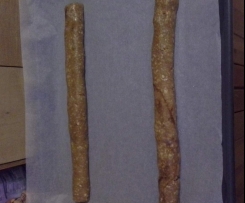 - Die Stangen auf der Arbeitsplatte in ca 1 1/2 cm dicke Scheiben schneiden und aufs Blech legen.