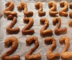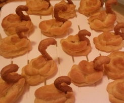 In Spritzbeutel geben und aus ca. 2/3 des Teiges zehn mittlere ovale Körper auf ein mit Backpapier ausgelegtes Backblech geben. Aus dem restlichen Teig zehn "S-Formen" als Hals spritzen.
