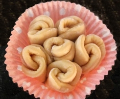 Man kann die fertigen Blümchen vor dem Backen mit gehackten Nüssen und/oder Hagelzucker bestreuen.