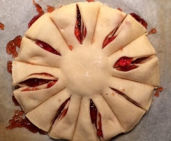 In die Mitte des Kreises eine runden Gegenstand legen und den Teig, wie auf dem Foto zu sehen ist, in 16 Stücke einschneiden.