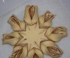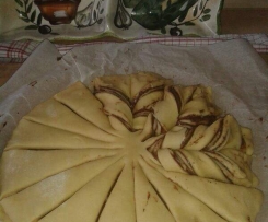 5. Die Spitzen des Teiges abwechselnd einmal links einmal rechts oder alle nach Links oder alle nach rechts, zweimal um sich selbst drehen, und alle Teigspitzen drehen bis es eine Blume ergibt.
