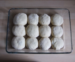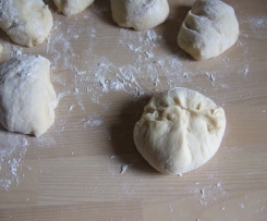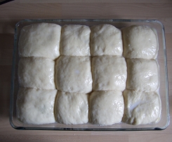 Teig in 12 gleichgroße Sücke teilen. Teigstück flach dücken - mit Pflaumen füllen - etwas Zimt darüber - zur Kugel formen und in eine GROSSE gefettete Auflaufform geben.