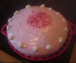 "Mixtopf geschlossen" geben und kurz auf Stufe 10 pulverisieren. Die zwei Eiweiß, Zitronensaft und ein paar Tropfen Lebensmittelfarbe dazugeben und alles auf Stufe 4 in 1 Minute glatt rühren. Den Guss auf den abgekühlten Kuchen geben und nach Lust und laune verzieren oder einfach so lassen.