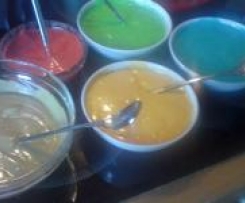 "Mixtopf geschlossen" wiegen und auf Stufe 4 / 1 Minute verrühren. Anschlöießend das mehl zuwiegen, das Backpulver zugeben und alles nochmals auf Stufe 6 / 20 Sekunden verrühren.Nun den entstandenen Teig in verschiedene Schüsselchen füllen und diese dann mit verschiedenen Lebensmittelfarben verrühren.