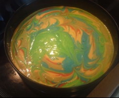 Jetzt eine 26 er Springform einfetten und den gefärbten Teig Löffelweise von der Mitte aus in die Springform geben. Immer eine andere Farbe auf die Mitte geben...der Teig läuft von alleine zum Rand der Springform.