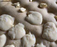 Den restlichen Teig auf einer bemehlten Arbeitsfläche auf Backblechgröße ausrollen und damit den Apfelkompott bedecken. Den Rand etwas festdrücken und 20 Minuten abgedeckt gehen lassen.