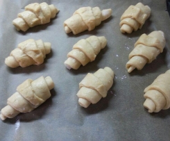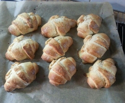 Mehl, Salz und Eier dazu, verkneten bis sich ein Kloß bildet .. nach und nach die Butter zufügen. Auf Stufe Modus „Teig kneten“" Modus „Teig kneten“" 10 Min kneten. Wenn der Teig klebt etwas Mehl zugeben und zu einer Kugel formen . 30-45 Min. im Ofen bei 35 Grad gehen lassen. Den Teig mit der Hand etwas flach drücken, mit dem Nudelholz rund ausrollen und in 16 Tortenstücke mit dem Pizzaroller schneiden und Hörnchen rollen. Auf ein mit Backpapier ausgelegtes Backblech legen und mit der Ei/Butter Masse bestreichen und bei ca. 180 Grad ca. 15-20 Min. backen.