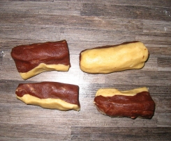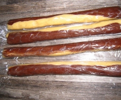 "Mixtopf geschlossen" ]Kakao und O-saft für ca. 15 sec. auf St. 3-4 vermischen,beide Teighälften nun kurz mit Hand locker zusammenfügen, dass ein marmorierter Teig entsteht, 3 bis 4 Rollen daraus formen und mind. 3 Stunden kalt stellen (besser über Nacht), in ca 0,5 cm dicke Scheiben schneiden, auf Backpapier bei vorgeheizten Ofen 190 Grad auf mittlerer Schiene 10-11 min backen