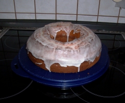 2-3 Eßlöffel Limettensaft und Puderzucker zu einem dicken Guss verrühren . Guss so über den Kuchen geben, dass er am Rand herunter läuft. Mit restlicher Limettenschale  bestreuen