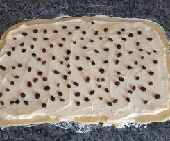 6. Pudding auf den Teig streichen und Rosinen darauf verteilen. - 7. Teig aufrollen und in ca. 8-10 gleichgroße Schnecken schneiden.