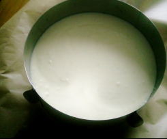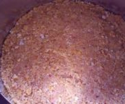 In eine Springform 24 cm oder Tortenring mit Backpapier einfüllen, festdrücken( Geht gut mit em Messbecher) und aufpassen, dass der Rand gut angedrückt wird. Dann in den Kühlschrank für eine halbe Stunde.