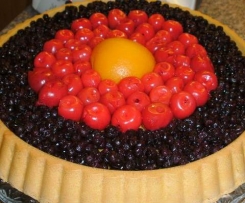 Obst auf dem Bisquitt-Boden legenäußeren Rand mit Heidelbeeren beinnen,weiter mit Kaiserkirschen belegen,und in die Mitte den halben Pfirsich legen