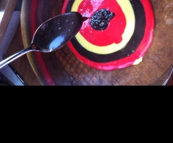 Zwei Löffel voll gelb in die Mitte der Form geben. Direkt darauf zwei Löffel rot. Danach zwei Löffel schwarz, usw.....