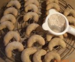 Inzwischen 25g Zucker und 1/2 Tl Zimt mischen, 25 g Zucker mit 10 g Vanillezucker mischen( oder auch etwas mehr Vanillezucker, je nach Geschmack). Restliches Cappuccinopulver und 25 g Zucker mischen. Passend zu den Geschmacksrichtungen die heißen Kipferl vorsichtig darin wenden, oder mit einem Sieb besteuben. Auf ein Gitter setzen und auskühlen lassen.