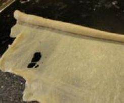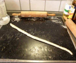 5. Ist das Teigstück auf diese Weise ausgerollt und ausgezogen, rollt man