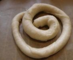 einem länglichen Fladen ausrollen. Mit etwas Schmalz bestreichen.