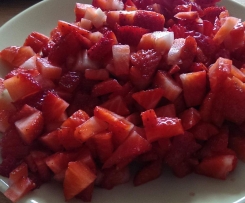 Erdbeeren waschen und in Würfel schneiden. Deko Erdbeeren in der Hälfte (längs) auseinander schneiden und beiseite stellen, am besten nochmal in den Kühlschrank)