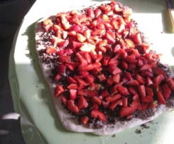 " Modus „Teig kneten“" .Auf einer bemehlten Arbeitsfläche den Teig zu einem Rechteck ausrollen und mit der weichen Butter bestreichen. Den Zucker, die Schokolade und die Erdbeeren darauf verteilen