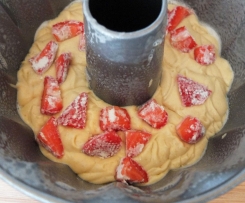 Eine Guglhupfform einfetten und ca 1/3 des Teiges einfüllen, mit ein paar Erdbeerstücken belegen, nochmal 1/3 Teig drauf und die restlichen Erdbeerstücke verteilen.