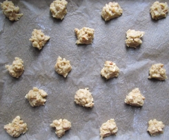 Mit 2 Teelöffeln kleine Teigportionen mit großem Abstand auf die Bleche setzen (ich hatte ca. 5 cm Abstand). Je nach Größe bekommt man 50 bis 60 Kekse. Ich habe den Teig vorher umgefüllt, weil ich ihn so besser portionieren kann....
