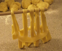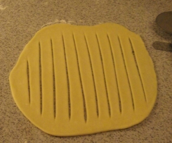 Nun werden die Kugeln einzeln ausgerollt und mit einem Teigrad Steifen in den Teig geschnitten von ca. 1 cm Stärke, oben und an den Seiten immer einen Rand von ca 1 cm Stärke lassen.