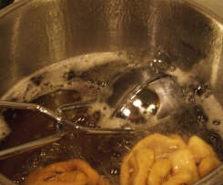 Nun gebt ihr den Teig in euer "Schneballeneisen" (ihr könnt auch zwei kleine Haarsiebe aneinander halten oder ihr haltet den Teig mit einer Gabel sporadisch zusammen) und gebt den Teig in das heiße Fett und backt ihn bis er eine schöne goldene Farbe hat.