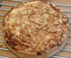 Äpfel schälen, entkernen, vierteln und mit einem V-Hobel in sehr dünne Scheiben schneiden. Diese mit Zimt und Zucker in einer Schüssel gut vermischen und auf den Teig kreisförmig auflegen. Mit Mandelplättchen bestreuen.
