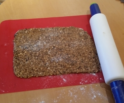 " Modus „Teig kneten“" zu einer gleichmäßigen Masse mischen. Zwischendurch mit dem Spatel alles nach unten schieben. - Die Masse auf ein Backpapier leeren und mit dem Nudelholz ausrollen. (Bei mir wird es ca. 20x30 cm und 1 cm dick). Wenn man etwas Mehl drauf stäubt hängt es auch nicht am Nudelholz fest.