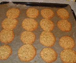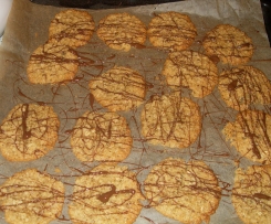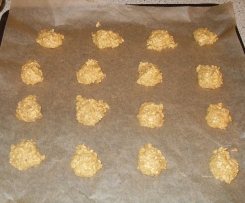 mit einem Teelöffel kleine Häufchen auf das Backblech setzen ( platz lassen denn Kekse laufen auseinander ) und bei 180 grad ca. 8 -10 min glodbraun backen ( je nach Ofen )