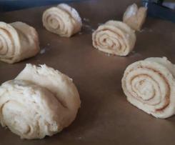 Teig ca. 80 x 40 cm ausrollen. Mit dem Orangensaft bestreichen, Zimtzucker darüber streuen. Von der Längsseite her fest aufrollen. In ca. 4 cm breite Stücke schneiden. Diese in der Mitte parallel zu den Schnittflächen mit einem Kochlöffelstiel fest eindrücken, sodass sich die Kanten hochbiegen. Auf zwei Bleche mit Backpapier setzen.