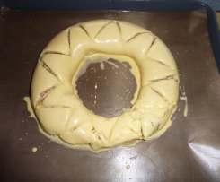 2. Nach dem Bestreichen wird der Teig von der Längsseite her aufgerollt und zu einem Kranz gleich auf das mit Backpapier belegte Backblech gelegt. Das eine Ende in das zweite Ende legen und andrücken. Danach mit einem scharfen Messer vorsichtig ein Zick-Zack-Muster rings um den Kranz schneiden. Die Schnitte sollten schon 1 - 2 cm tief sein, damit das Muster nach dem Backen besser zum Vorschein kommt.