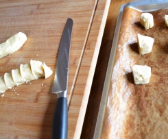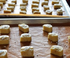 3. Rollen aus der Kühlung nehmen, etwa 10 Min. bei Raumtemperatur liegen lassen und dann mit einem scharfen Messer in gleich große Ringe schneiden und auf's Backblech legen...
