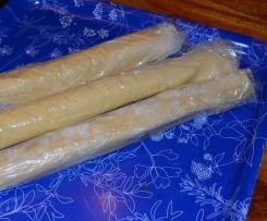 2. Teig in ca. drei Teilen mit Hilfe von Klarsichtfolie zu einer Rolle formen und eingewickelt am besten übernacht im Kühlschrank rasten lassen