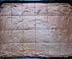 - Das Ganze im heißen Ofen ca. 25 Minuten backen. Etwas abkühlen lassen und noch lauwarm in Stücke schneiden. Man kann auch kleine Keksportionen daraus machen.