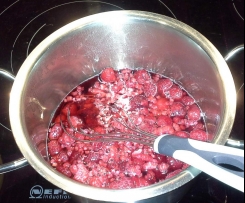 Nun die gefrorenen Himbeeren in den Topf geben und vorsichtig umrühren, bis alle Beeren mit Flüssigkeit bedeckt sind.