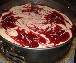 Die Hälfte der Quarkcreme in die Springform füllen. Nun von der Hälfte der Himbeermasse, 5 Häufchen auf der Quarkcreme bilden und mit Hilfe eines Holzspießes leicht mit der Creme marmorieren. Die restliche Creme vorsichtig darauf verteilen, wieder fünf Himbeerhäufchen machen und mit dem Holzspieß marmorieren.