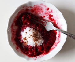 3. Die Himbeeren mit Zucker und Zimt mit einer Gabel zerdrücken.