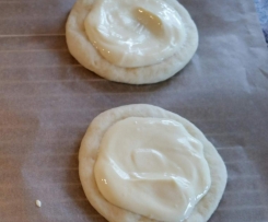 - Jede Kugel zu einem kleinen Handteller großen Teigling formen und mit der Vanillecreme bestreichen. Ich habe immer einen guten EL pro Teigling genommen.
