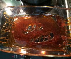 - Zucker und Wasser in den Mixtopf fügen und 10 Min/90°/Stufe 1 schmelzen lassen. In der Backform gleichmäßig verteilen.