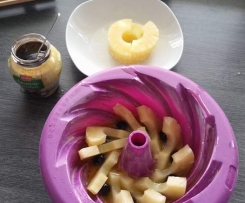 Öl und Saft zugeben, dann Backpulver mit Mehl und Puddingpulver in den Mixtopf dazusieben und 7 Sek./Stufe 4 unterheben... Evtl. mit dem Spartel noch etwas nacharbeiten und auf der geschichteten Ananas verteilen.