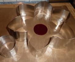 Den sauberen Tortenring auf eine Backfolie stellen. Als Unterlage eignet sich am besten die Arbeitsplatte der Küche, muß natürlich hitzebeständig und eben sein.