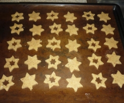 Den Backofen auf 180 °C ( Umluft 160°C ) vorheizen. Backblech mit Backpapier belegen. Den Teig portionsweise auf der leicht bemehlten Arbeitsfläche ca. 4 mm dick ausrollen und Sterne ausstechen. Aus der Hälfte der Sterne mittig kleinere Sterne oder Kreise ausstechen. Ich habe gleich Förmchen genommen die gleichzeitig den Stern in der Mitte ausstechen. Der Durchmesser meiner Förmchen beträgt ca. 5 cm.