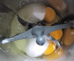 2.     Den Rühraufsatz im Mixtopf geschlossen"Mixtopf geschlossen" einsetzen. Eier, heißes Wasser und Zucker in den Mixtopf geschlossen"Mixtopf geschlossen" wiegen.