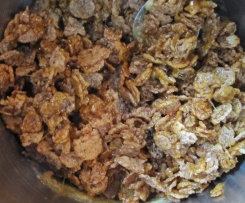 11.     Den Topf von der Platte nehmen, sofort Butter und Cornflakes hinzufügen und mit dem Karamell verühren.
