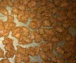 Backofen vorheizen, 150 °C, den Teig mit 2 Teelöffeln abstechen und auf das mit Bachpapier ausgelegte Blech setzen, Wenig Abstand nötig, da sich der Teig kaum ausbreitet.